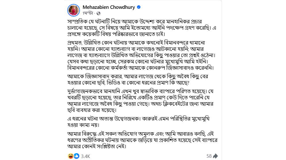 মঙ্গলবার (২৪ ফেব্রুয়ারি) নিজের ভেরিফায়েড ফেসবুক পেজে দেওয়া পোস্টে তিনি বলেন, সম্প্রতি তাকে জড়িয়ে যে মানহানিকর প্রচার চালানো হয়েছে, সে বিষয়ে তিনি ইতোমধ্যে আইনি পদক্ষেপ নিয়েছেন। তার দাবি, উল্লিখিত কোনো ঘটনায় তাকে কখনোই বিমানবন্দরে আটকানো হয়নি। এমনকি তার কোনো হ্যান্ডব্যাগ বা লাগেজও জব্দ করা হয়নি। তার লাগেজে অবৈধ কিছু পাওয়ার প্রশ্নই ওঠে না বলেও উল্লেখ করেন তিনি।