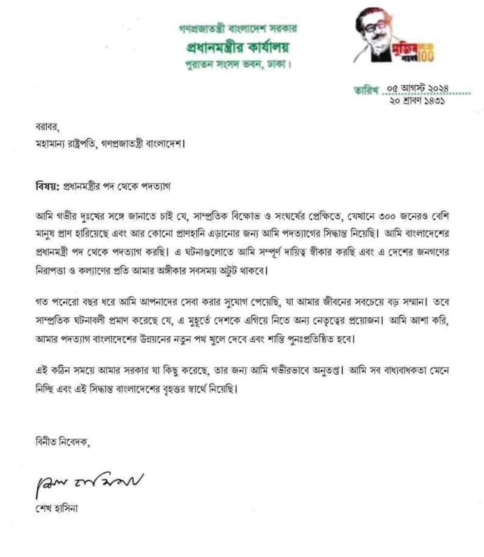 ওই চিঠিতে শেখ হাসিনা লেখেন, আমি গভীর দুঃখের সঙ্গে জানাতে চাই যে, সাম্প্রতিক বিক্ষোভ ও সংঘর্ষের পরিপ্রেক্ষিতে যেখানে ৩০০ জনেরও বেশি মানুষ প্রাণ হারিয়েছেন এবং আর কোনো প্রাণহানি এড়ানোর জন্য আমি পদত্যাগের সিদ্ধান্ত নিয়েছি। আমি বাংলাদেশের প্রধানমন্ত্রী পদ থেকে পদত্যাগ করছি।