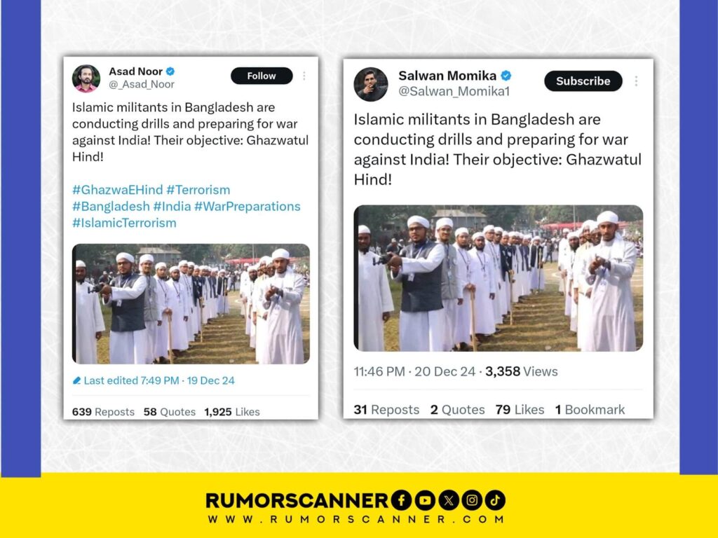 বাংলাদেশের মুসলিমরা ভারতের বিরুদ্ধে যুদ্ধের প্রস্তুতি নিচ্ছে দাবি জানিয়ে ইন্টারনেটে একটি ছবি প্রচার করা হচ্ছে। ইন্টারনেটে অস্ত্র ও লাঠি হাতে একদল মাদ্রাসা ছাত্রের ছবি প্রচার করে দাবি জানানো হয়, বাংলাদেশের ইসলামী জঙ্গিরা ভারতের বিরুদ্ধে অস্ত্রহাতে যুদ্ধের প্রস্তুতি নেয়ার সময়ের ধারণকৃত ছবি এটি। এ বিষয়ে একটি প্রতিবেদন প্রকাশ করেছে বাংলাদেশের তথ্য যাচাইকারী প্রতিষ্ঠান (ফ্যাক্ট চেক) রিউমর স্ক্যানার। তাদের অনুসন্ধানে জান যায়, ছবিটি ভুয়া।
