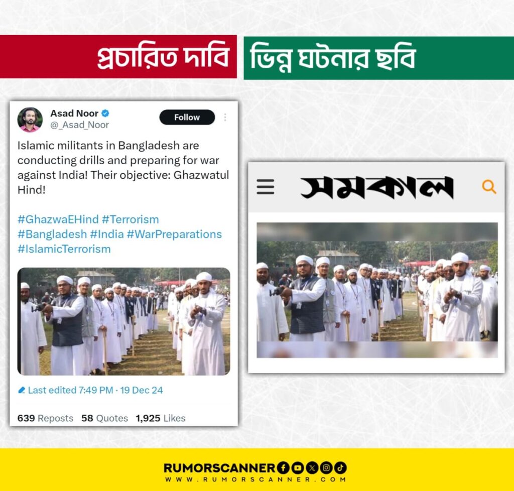 রিউমর স্ক্যানার জানায়, এই ছবিটি বাংলাদেশের মুসলিমদের ভারতের বিরুদ্ধে যুদ্ধের প্রস্তুতি নেয়ার নয় বরং, অস্ত্রহাতে প্লাস্টিকের খেলনা বন্দুক হাতে নিয়ে যুবকের দাঁড়ানোর একটি ছবিতে উক্ত দাবিতে প্রচার করা হয়েছে। এ বিষয়ে অনুসন্ধানে মূলধারার গণমাধ্যম সমকালের অনলাইন সংস্করণে গত ১৬ ডিসেম্বর ‘মাদ্রাসা ছাত্রের হাতের বন্দুকটি খেলনা ছিল’ শীর্ষক শিরোনামে প্রকাশিত একটি প্রতিবেদন খুঁজে পাওয়া যায়। উক্ত প্রতিবেদনে যুক্ত একটি ছবির সঙ্গে আলোচিত ছবিটির মিল পাওয়া যায়।